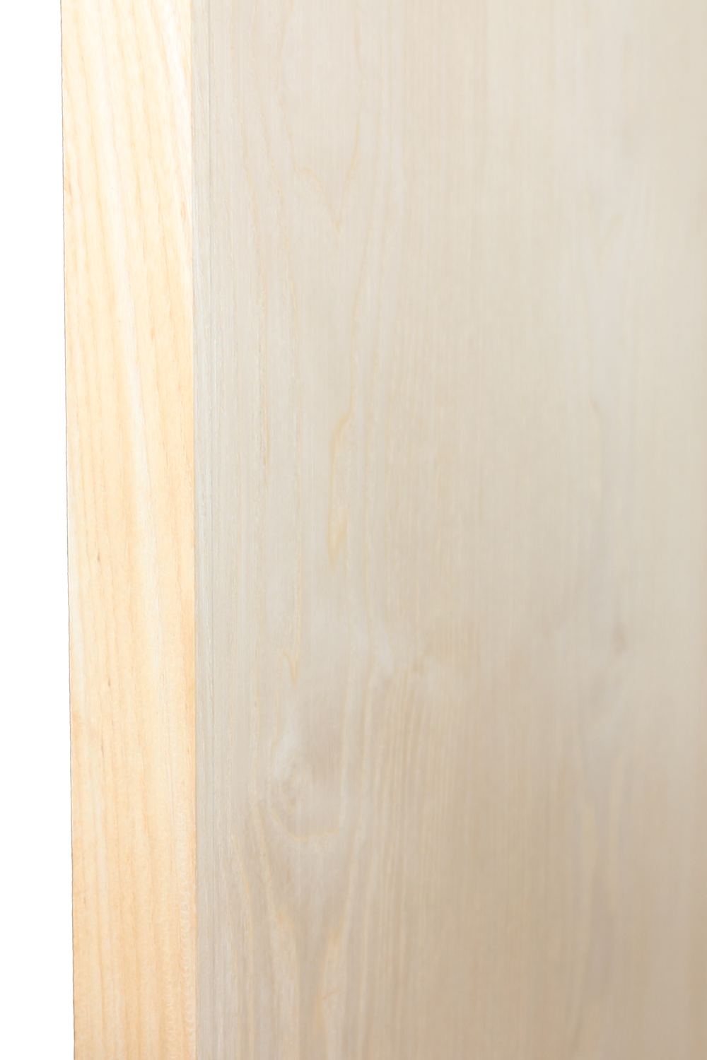 Made up with white ash veneer pressed on MDF board and 2 White Ash timber edge strips on both sides of the door.